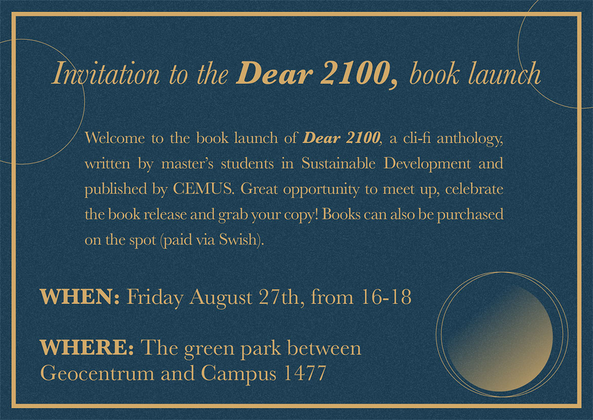 Welcome to the book launch of Dear 2100, a cli-fi anthology, written by master’s students in Sustainable Development and published by CEMUS. Great opportunity to meet up, celebrate the book release and grab your copy! Books can also be purchased on the spot (paid via Swish).